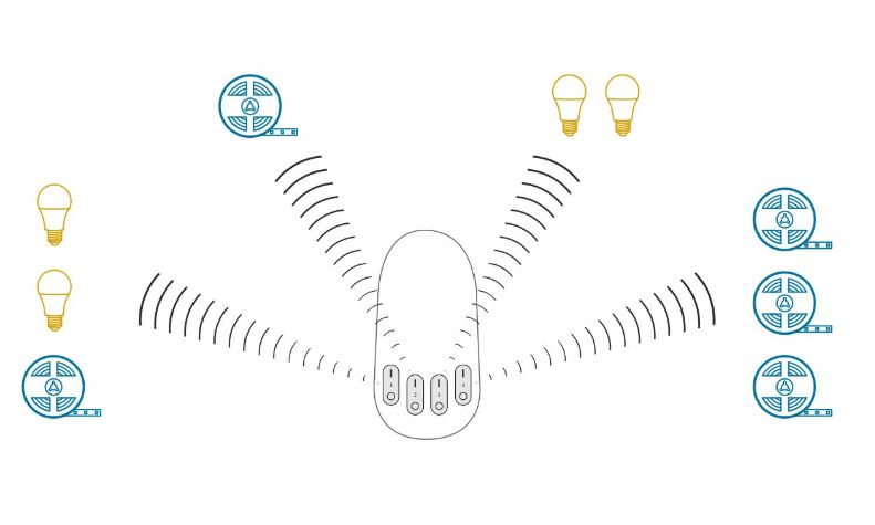 - ✅ Do każdej strefy można przypisać dowolną liczbę odbiorników MiBOXER, takich jak kontrolery do taśm LED czy inteligentne żarówki (sprzedawane oddzielnie). Dzięki temu system sprawdzi się zarówno w małych, jak i rozbudowanych instalacjach świetlnych.