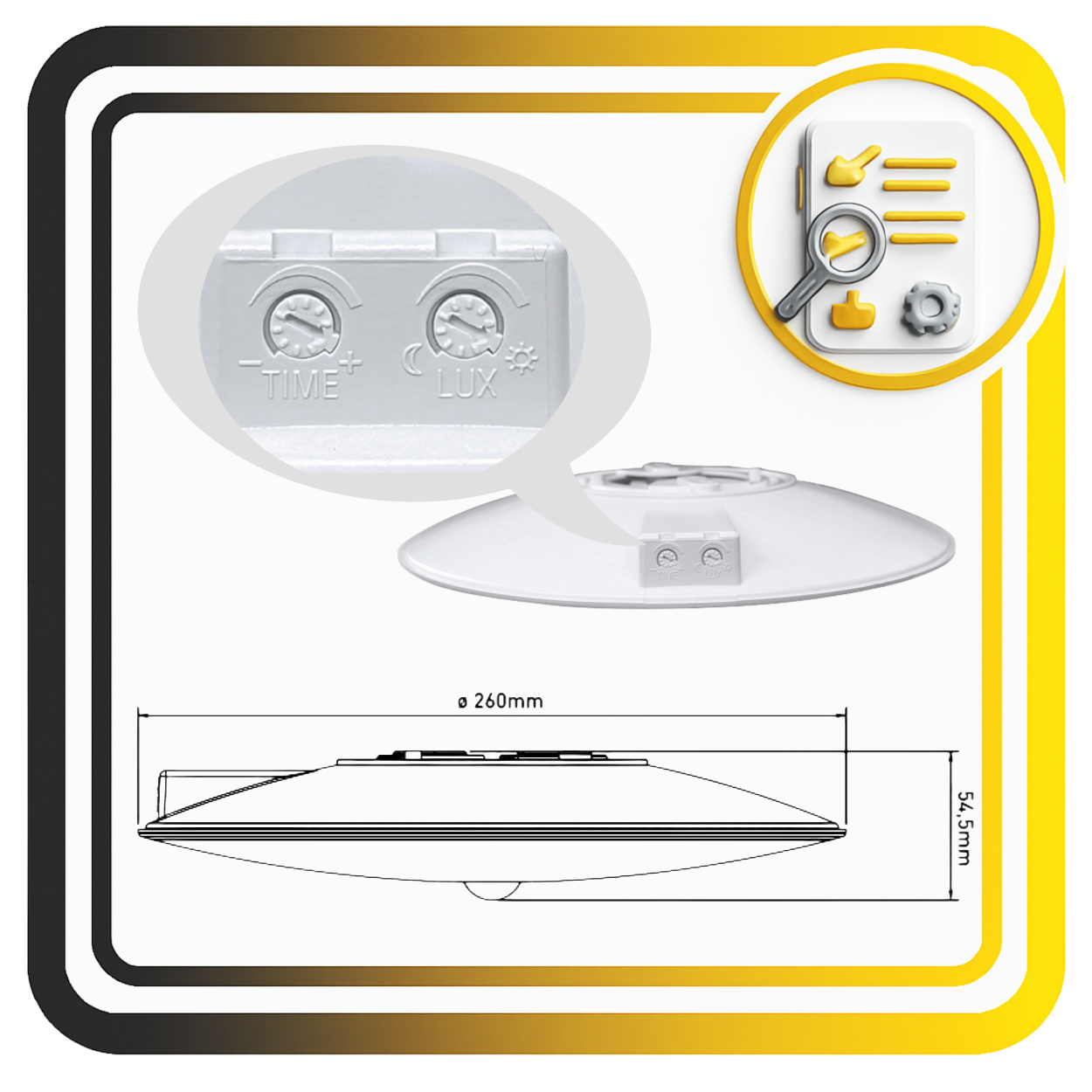 ⭐ Plafon LED z PIR to wygoda i oszczędność: automatyczne włączanie przy ruchu, a szczelna obudowa IP54 chroni przed kurzem i wilgocią. Pokrętła TIME i LUX umieszczone z boku ułatwiają dopasowanie ustawień do miejsca montażu.