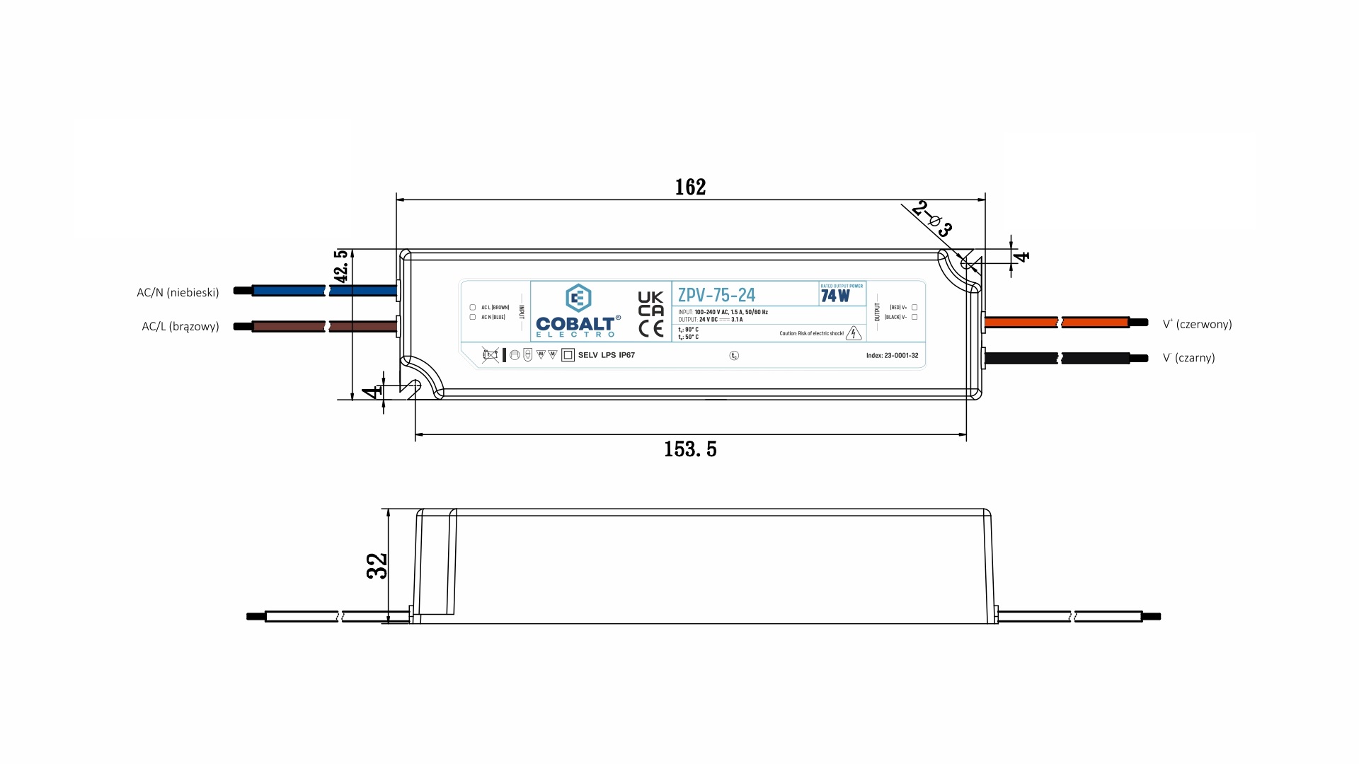 - Wymiary: 162 × 42.5 × 32 mm
