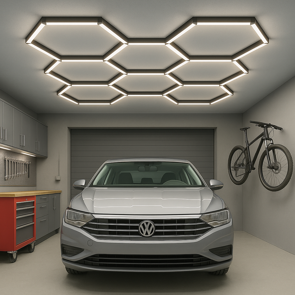 Zestaw HEXAGON 5 to nie tylko źródło światła, ale także element wystroju przestrzeni. Doskonale sprawdza się w warsztatach, salonach auto detailingu, studiach tatuażu, salonach kosmetycznych, barber shopach, showroomach czy loftowych wnętrzach mieszkalnych.